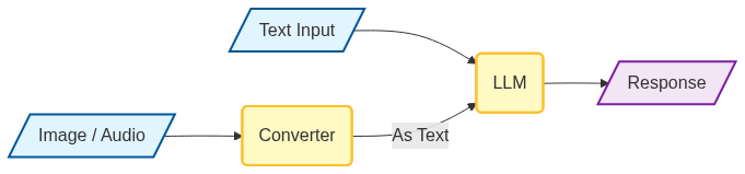The LLM itself typically still accepts text as its primary input. The process that makes multimodal integration possible happens outside the LLM. It involves separate models or processes that are specialized in interpreting the non-text data, like images or audio. These models extract relevant information from the non-text data and then convert it into a text-based representation. This text representation is then fed into the LLM, allowing it to understand and respond to the combined multimodal input.