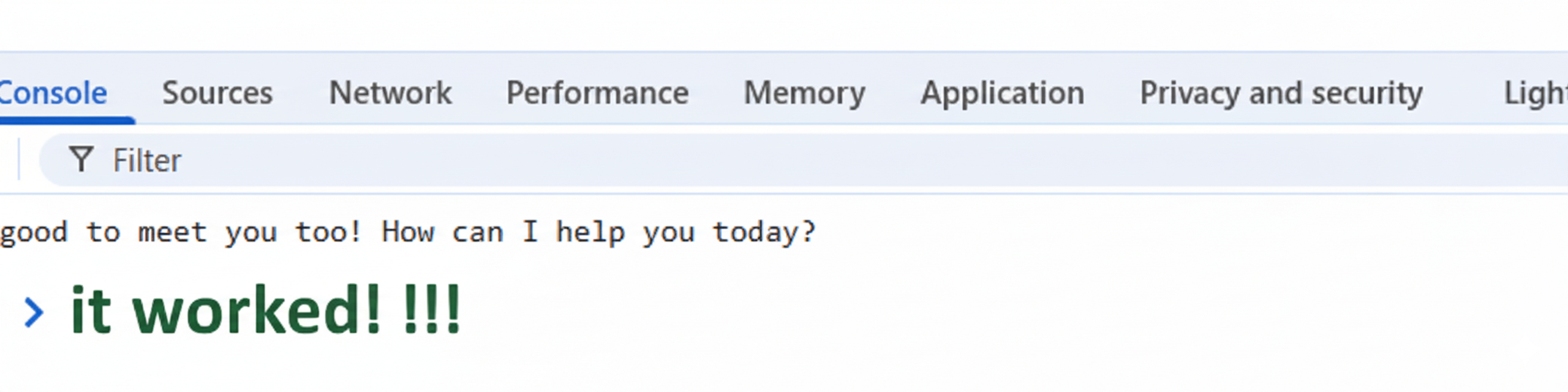 Check the Console tab. After a moment, you should see the text response from the Gemini model printed in the console. It will likely be a friendly greeting in response to your “Hello, world!” prompt.